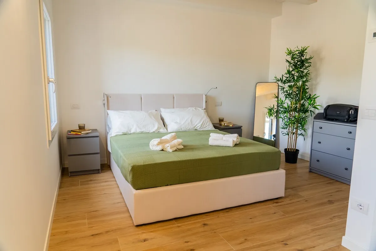 L’appartamento dispone di una camera matrimoniale spaziosa, con armadio a vista per riporre comodamente i vostri effetti personali. Il soggiorno open space è pensato per il relax e la convivialità, con una cucina completamente attrezzata, un tavolo da pranzo e un divano letto confortevole per altri due ospiti. Il bagno moderno, dotato di doccia, water, lavabo e bidet, garantisce comfort e funzionalità. L’aria condizionata assicura un soggiorno piacevole in qualsiasi stagione.
